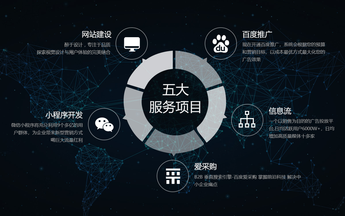 集團(tuán)以為企業(yè)提供最完善、最有效的網(wǎng)絡(luò)營(yíng)銷(xiāo)策劃方案為使命,目前擁有九家全資分公司,囊括電子、機(jī)械等在內(nèi)的 37個(gè)一級(jí)行業(yè)和201個(gè)二級(jí)行業(yè)。業(yè)務(wù)覆蓋青島、濟(jì)南、煙臺(tái)、濰坊、威海、日照、臨沂等山東半島,經(jīng)營(yíng)業(yè)務(wù)主要有搜索推廣、直通車(chē)、糯米、信息流、全景地圖、金融、滴滴打車(chē)、網(wǎng)絡(luò)增值、瑞思英語(yǔ)九大模塊,是搜索、糯米、金融、滴滴打車(chē)等互聯(lián)網(wǎng)企業(yè)在山東半島的獨(dú)家運(yùn)營(yíng)商與合作伙伴。